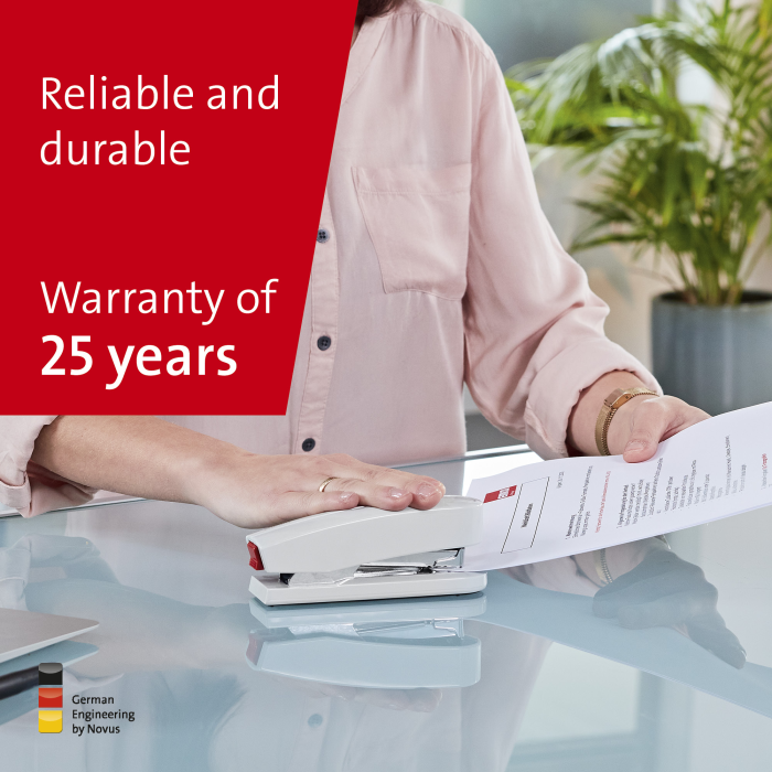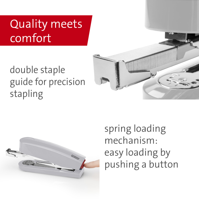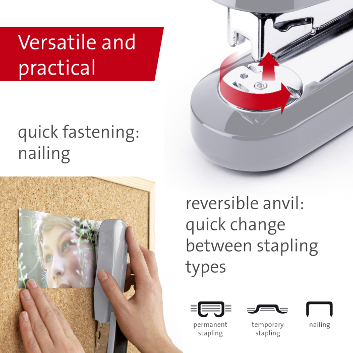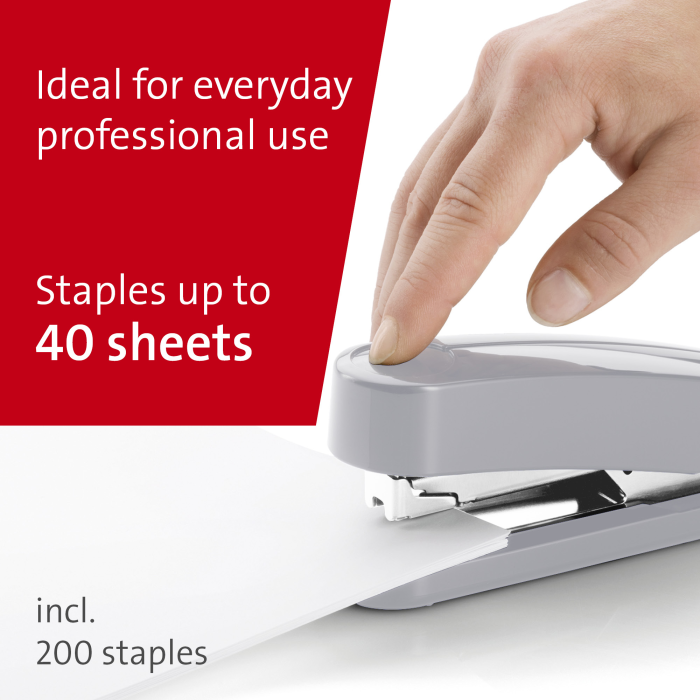 Kompaktná vysokovýkonná zošívačka v kovovom prevedení s plastovým vrchným dielom a dvojitým vedením spiniek. Kapacita náplne 100 spiniek 24/6 - 8 alebo 150 spiniek 26/6 - 8. Hĺbka zošívania 6,5 cm. Hmotnosť 245 g. Záruka 25 rokov. Farba: sivá Kapacita listov: 40 Hĺbka zošívania: 6,5 cm